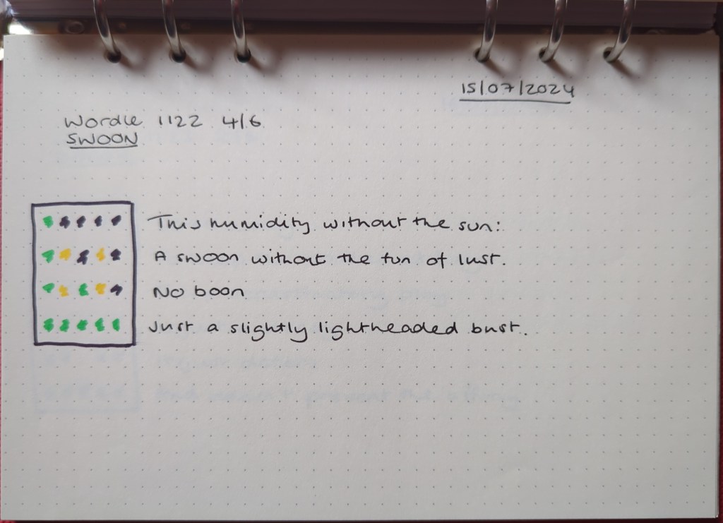 Wordle prompt poems – July 2024 Click on an image to view poems as a slideshow. Share this: Share on X (Opens in new window) X Share on Facebook (Opens in new window) Facebook Like Loading... Related